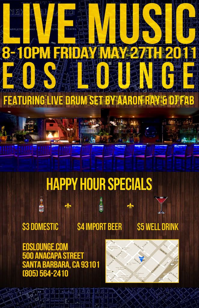 Drop by Happy Hour to experience Aaron Ray live on drums in tandem with DJ Fab for a fresh, hip, & sexy ambiance. Live music running from 8-11PM.