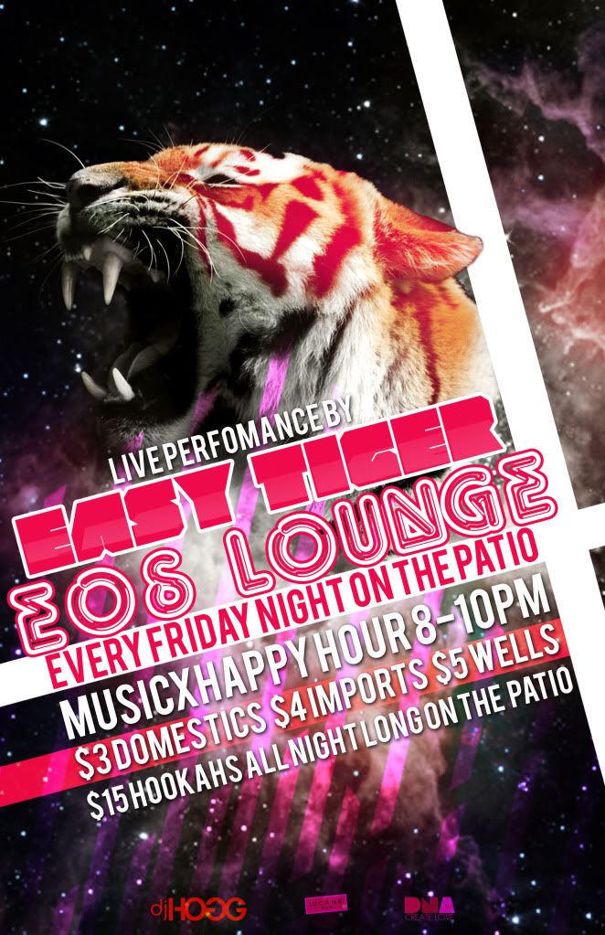 Don't miss out on a special live performance by Easy Tiger from 8-10PM on the patio at EOS Lounge for happy hour. We are running $3 Domestics, $4 Imports, & $5 Well Drinks along with our $15 Hookah special for Happy Hour.